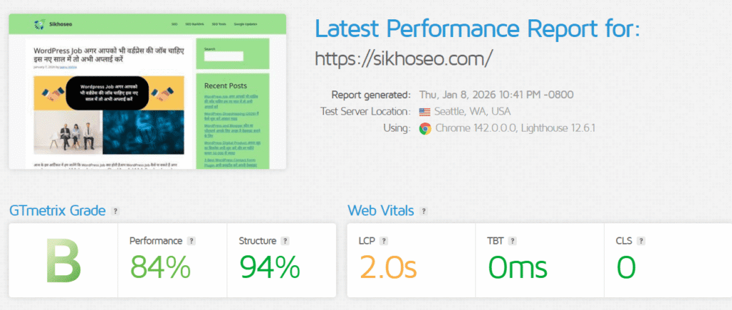 यह एक वेबसाइट है जिसे मैंने स्कैन किया है। जैसा कि आप देख सकते हैं, परफॉर्मेंस स्कोर 84% है, जिसका मतलब है कि इस वेबसाइट की स्पीड बहुत अच्छी है। आपको भी इसी तरह अपनी वेबसाइट की स्पीड चेक करनी चाहिए। यह नंबर जितना ज़्यादा होगा, आपकी वेबसाइट की स्पीड उतनी ही अच्छी होगी, और नंबर जितना कम होगा, आपकी वेबसाइट उतनी ही धीमी होगी। आपको इसे ठीक करना होगा।